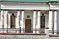 Входные группы в театр и в кинотеатр расположены по обе стороны центрального ризалита с отступом вглубь. Каждая из них выделена колоннадой из трёх спаренных колонн ионического ордера. За ней вход с однотипными прямоугольными окнами по сторонам[4].