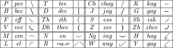 Согласные в системе Питмана произносятся следующим образом: пи, би, ти, ди, чей, джей, кей, гей, эф, ви, ит (ith), ди (thee), эс, зи, иш, жи, эм, эн, инг (ing), эл, ар, рей, вэй (way), йей (yay), хей. Для звука r имеется две графемы: ар и рей.
