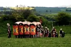 Учитывая закруглённую форму щита, единственную ручку с внутренней стороны умбона и мечи, которые римские легионеры носили не на левом, а на правом боку, следует предположить, что щит держали не перед грудью, а вдоль левого бока, и римский легионер теснил противника, налегая на щит плечом и помогая себе коротким мечом, который при таком использовании щита удобнее носить именно справа.