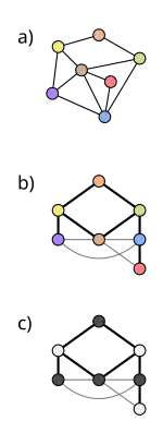 Любой граф имеет слабую 2-раскраску. Рисунок справа показывает простой алгоритм построения слабой 2-раскраски произвольного графа. Фрагмент (a) показывает исходный граф. Фрагмент (b) показывает дерево поиска в ширину того же графа. Фрагмент (c) показывает, как раскрасить дерево — начиная с корня, уровни дерева раскрашиваются попеременно цветом 1 (тёмный) и 2 (светлый).
