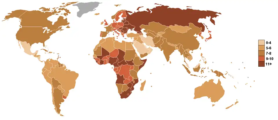- Россия — 7,4 ‰ (по данным Росстата на 2011 год[7], по данным Росстата на 2016 год 6,0 ‰, городское население 5,5 ‰, сельское 7,6 ‰)