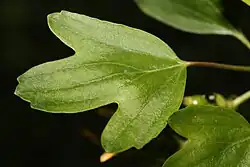 Листья очерёдные, длиной около 5 см, шириной 6 см, в очертании округло-почковидные, с 3 глубокими тупыми 2—3-зубчатыми лопастями и клиновидным основанием, с обеих сторон голые.