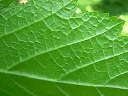 Листья длиной 2—10 см, яйцевидные в очертании, с сердцевидным основанием, на длинных (2—10 см) черешках. Листовая пластинка глубоко рассечена на 5—7 яйцевидно-ланцетных, заострённых на концах лопастей с остропильчатыми краями. Листья имеют сладковатый неприятный запах, за что этот вид получил английское название stink currant — вонючая смородина[3].
