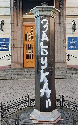 - 11 октября 2022 года в Киеве неизвестными был демонтирован второй бюст Пушкина перед Национальным транспортным университетом. Демонтаж посвятили лейтенанту Вооружённых сил Украины Денису Антипову (позывной «Бук») — известному общественному активисту, преподавателю корейского языка в Киевском национальном университете имени Тараса Шевченко, погибшем в мае 2022 года в бою с российскими войсками.