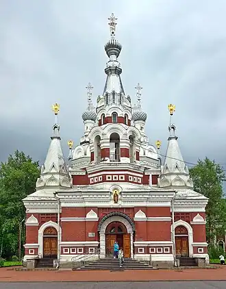 Пятиглавый собор — квадратный в плане с выступающими полукруглой апсидой и колокольней. По углам здания возвышаются шатровые башни, украшенные двуглавыми орлами.
