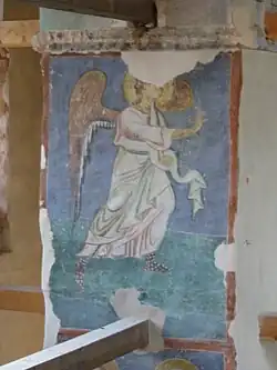 Лучше всего сохранилась роспись восточных столбов на обращенных к молящимся западных гранях. Сверху здесь изображено Благовещение. Фигуры Архангела Гавриила и Богоматери по сложившейся традиции изображены по отдельности так, что сцена происходит как бы в пространстве самого храма. Под Благовещением расположены четыре фигуры святых целителей — Кира и Иоанна, Флора и Лавра. Если двое из них держат в руках сосуды с лекарствами, очень напоминающие дароносицы, то другие двое (по одному в каждой паре) имеют в руках свитки. Здесь очевидно вместе с исцелением тела подчеркивается исцеление души христианским учением. Причем изображения целителей фланкируют алтарь храма, показывая, что именно здесь человеку подается исцеление.