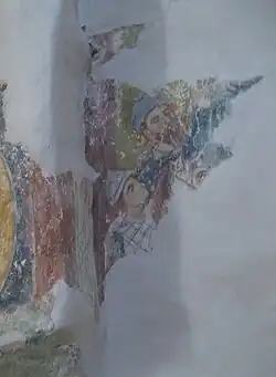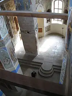 Под этими фресками крепился темплон алтарной преграды, в котором первоначально вероятно не было других икон, кроме образов Спасителя и Богоматери. Алтарь закрывала крепившаяся к темплону завеса. На неё намекают изображенные в нижней части столбов полотенца[3].