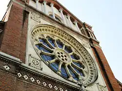 В архитектуре фасада выделяется большое неоготическое окно-роза над главным входом.