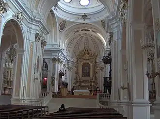 Боковые нефы покрыты куполами (в правом нефе есть три монофоры); центральный неф с мощными пилястрами с квадратным мраморным цоколем, поддерживающими свод с люнетами, украшенными картинами со сценами из жизни Пресвятой Девы Марии и Святого Иустина из Кьети. В трансепте два богато украшенных алтаря и две часовни. Над трансептом большой круглый купол с восемью слуховыми окнами.