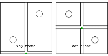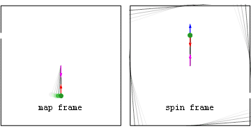 Вид из покоящейся (map frame) и автомобильной (car frame) систем отсчета физических (красные) и геометрических (синие) ускорений для автомобиля, движущегося от одного знака остановки до другого.