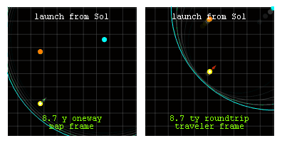 Вид из системы покоя (слева) и системы путешественника (справа) путешествия в обе стороны с постоянным ускорением 1 g (красная стрелка в системе путешественника) между Солнцем (жёлтый кружок) и гипотетической звездой (голубой кружок) на расстоянии в 6,9 светового года. Проксима Центавра (оранжевый кружок) в 4 световых годах от Солнца показана в левом верхнем углу