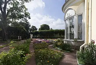 Две пересекающиеся аллеи сада были перекрыты деревянным трельяжами с вьющимися растениями, на главной аллее установлены постаменты из цветного мрамора с мраморными цветочными вазами[4] типа кратеров (12 сделаны в России в конце XVIII века, две более крупные — Италия, XVIII век[5]). Главная аллея, ведущая к павильону трёх граций, делит партер перед фасадом на две части, партер отделён от сада поперечной аллеей с высаженными вдоль неё розами. Существовавший ранее трельяж отделял парадную часть сада от ботанической. На центральной площадке ране стояла Флора Фарнезе, с начала XIX века вместо неё была поставлена утраченная во время войны скульптура[3] 1781 года[5] Т. Бенкса «Амур с бабочкой на плече» («Амур, снимающий с крыла бабочку»[5])[3].