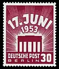 Сверху вниз, слева направо: Советские танки разгоняют демонстрантов на Шютценштрассе в Берлине · перед музеем им. Димитрова в Лейпциге · на Лейпцигер-штрассе в Берлине · Памятная марка бундеспочты · Охваченный пожаром Колумбус-хаус на Потсдамер-Плац