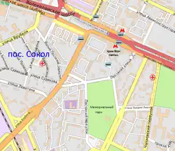 - Посёлок «Сокол», от которого станция получила своё название, находится примерно в 500 метрах к западу от метро. Он был основан в начале 20-х годов прошлого века. В его строительстве участвовали знаменитые архитекторы Н. В. Марковников, братья Веснины, И. И. Кондаков и А. В. Щусев[37]. Несмотря на то, что посёлок неоднократно находился под угрозой сноса, многие его постройки сохранились до сих пор. Комплекс зданий посёлка является памятником архитектуры регионального значения[38].