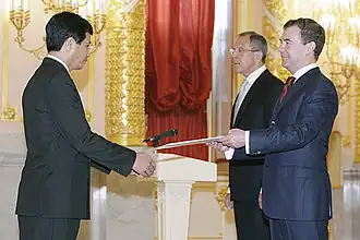 - ↑ Церемония вручения верительных грамот послами иностранных государств. Дата обращения: 22 февраля 2016. Архивировано 2 июля 2017 года.