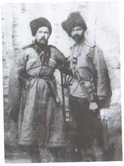 ![]() Военфельдшер 3-го линейного полка Кубанского казачьего войска вольноопределяющийся И. Л. Сорокин. г. Майкоп. 1914 год | ||||