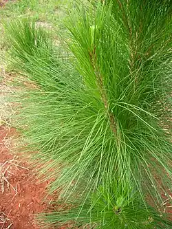 Хвоя желтовато-зелёная, в пучках по 3, 4, 5 игл, длиной 15—25 см.