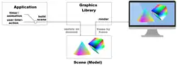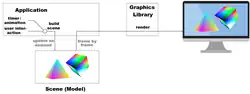 - графическая библиотека вместо клиента, сохраняет сцену (полную объектную модель примитивов рендеринга) для рендеринга, и