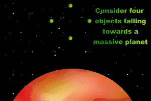 Четыре объекта (обозначены на схеме зелёными точками) движутся в гравитационном поле[4] по направлению к центру небесного тела. В соответствии с законом обратных квадратов, ближайший к небесному телу объект испытывает наибольшее ускорение, и если представить все четыре объекта частями одного, более крупного объекта, то очевидно, что он будет деформироваться за счёт приливных сил, и при соответствующей величине этих сил будет либо разорван, либо «вытянут».