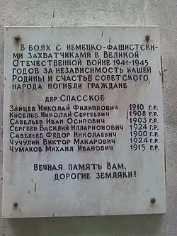 - В память о погибших в боях во время Великой Отечественной войны жителях деревни на одном из зданий вывешена мраморная мемориальная доска.