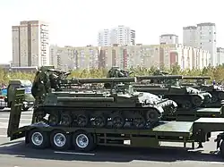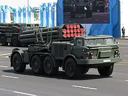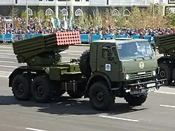 Пояснение: согласно некоторым источникам, на вооружении артиллерийских частей Сухопутных войск Казахстана, также имеются такие образцы вооружения как РСЗО «Найза» на базе КамАЗ-6350, самоходный 120мм миномёт «Айбат» на базе МТ-ЛБ и самоходная 122мм гаубица «Семсер» на базе КамАЗ-6350. Однако данные образцы, разработанные при участии специалистов израильских компаний Soltam Systems и Israel Military Industries, так и не были приняты на вооружение казахстанской армии. Причиной отказа принятия стали конструктивные недостатки, выявленные в ходе государственных испытаний. Так в миномёте «Айбат» после выстрелов происходила деформация днища тягача. Шасси гаубицы «Семсер» оказалось перегруженным. А в РСЗО «Найза» выход реактивных струй от снарядов мог повредить платформу на которой был установлен пакет с направляющими и кабину с расчётом. Из-за выявленных при испытаниях недостатков, было возбуждено уголовное дело, по которому главными обвиняемыми проходили Начальник Артиллерии и ракетных войск Сухопутных войск генерал-лейтенант Маерманов Кажимурат и гражданин Израиля Борис Шейнкман. В ходе судебного разбирательства было доказано, что все три образца оказались непригодными к эксплуатации, из-за технических просчётов израильских инженеров, а также некачественной сборки лицензионных систем на казахстанских оборонных предприятиях[29][30][31]. До ноября 2008 года казахстанская армия должна была получить 2 огневые батареи «Айбат» и «Семсер» по 6 единиц каждая, а также дивизион «Найза» из 18 единиц с транспортно-заряжающими машинами в комплекте. Однако были получены только по 2 единицы «Айбат», «Семсер» и «Найза»[32]. По состоянию на август 2009 года, артиллерийские системы «Найза» и «Семсер» так и не были приняты на вооружение[33].