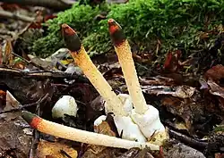 Сетконоска сдвоенная | Phallus duplicatus Bosc, 1811 | Плодовое тело плотное, шаровидной формы, 4—5 см в диаметре. Цвет гриба меняется со временем от белого до светло-коричневого. После созревания плодовое тело имеет форму шляпочного гриба. Длина ножки 15—20 см, диаметр 4—5 см. Ножка губчатая, цилиндрической формы, сужающиеся к основанию, имеет вольву у основания. Споры эллипсоидные, гладкие. Сапротроф, произрастает на гнилой древесине. В Томской области вид встречается в окрестностях Томска. |