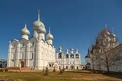 | 10. | Успенский собор | Ростов | 1161—1163, 1213—1231. | Собор выстроен вновь в начале XVI века. Под землёй обнаружен древний Леонтьевский придел, расположенный в южной апсиде существующего храма. | ![]() |