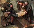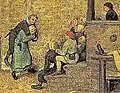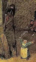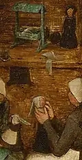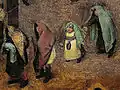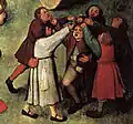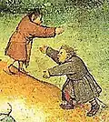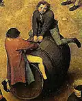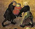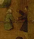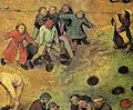 | 15 |  | Жмурки | Игра представляла собой шуточное сватовство: девочка, с повязкой на лице, выбирала себе «жениха». Голубой платок на её лице может быть аллюзией на фламандскую пословицу «надеть на кого-либо синий плащ», что означает «изменить супругу»[9]. |