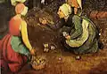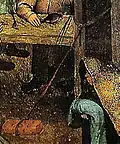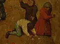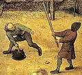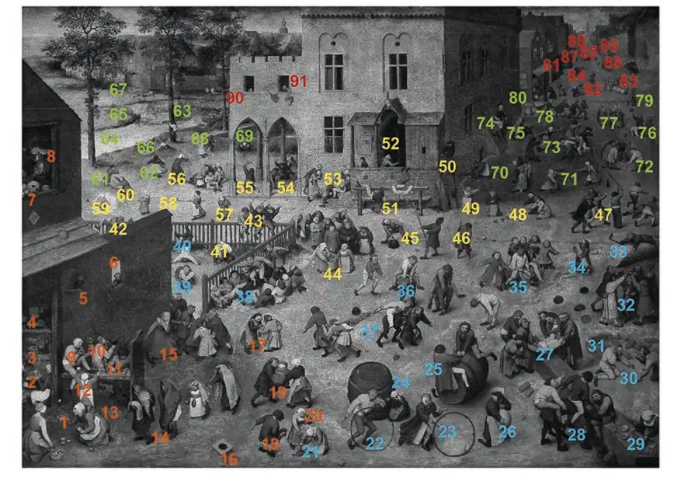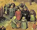 | 29 |  | Игра в магазин | Девочка делает «краску», натирая кирпич. Примечательно, во-первых, что в Антверпене, где жил и работал Брейгель, действительно изготавливали красный пигмент из кирпичей; во-вторых, что Брейгель расположил собственную подпись именно на доске, которую использует девочка, проводя тем самым юмористическую параллель со своей деятельностью художника[14]. |
