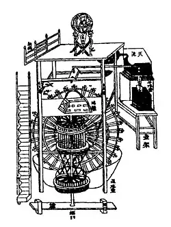 - Армиллярная сфера, с гидравлическим приводом: Гиппарх (190—120 до н. э.) приписывает изобретение армиллярной сферы, как модели небесной сферы, греку Эратосфену (276—194 до н. э.). Однако, китайский астроном Гэн Шоучан эпохи династии Хань (202 до н. э. — 220 н. э.) изобрёл её независимо в Китае в 52 г. до н. э. Затем китайский учёный Чжан Хэн (78 — 139 н. э.) первым использовал энергию для вращения армиллярной сферы посредством целого комплекса сложных механизмов, приводимых в движение водяным колесом. Водяное колесо, в свою очередь, получало энергию от постоянного напора воды в водяных часах; позже он улучшил эту систему путём введения компенсационного бака между резервуаром и приточным сосудом.[41]