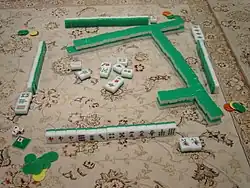 - Маджонг: Джелт Рэп пишет, что азартная игра маджонг (традиционный китайский: 麻将 пиньинь májiàng), в которой используется набор из более чем сотни костей, была впервые изобретена в 1846 году Чжэнь Юймэнем, дипломатическим чиновником эпохи династии Цин (1644—1912) из Нинбо.[189] Однако, Рэп прослеживает истоки игры к карточной игре эпохи династии Тан (618—907), в которой использовались тридцать две фишки из дерева или слоновой кости, похожие на карты. Потом игра эволюционировала, и в эпоху династии Мин (1368—1644) превратилась в игру мадяо (馬吊), в которой было сорок карт и четыре масти, вместо трёх в современном маджонге.[190]