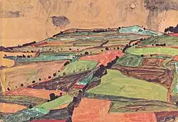 | (картина Шиле) нем. Wiese mit Dorf im Hintergrund II | ![]() | 1907 | картон, масло | 19,8 x 34,4 | P66 | частная коллекция, США | [89] |