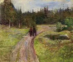 | Пейзаж с женщиной, идущей вдоль озера англ. Landscape with Woman Walking by a Lake, норв. Landskap med en kvinne som går langs vannet | ![]() | 1880 | картон, масло | 19,5 x 14 | 6 | местонахождение не установлено | |