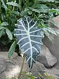 Алоказии декоративны своими крупными щитовидными листьями на длинных черешках с выраженными жилками; у некоторых видов они светлоокрашенные, почти белые, создающие контраст с тёмно-зелёным цветом листа, что придаёт растениям запоминающийся облик. | ||