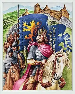 - ↑ Блок виконаний у візантійському стилі, що відповідає мистецькому стилю епохи того часу. На поштовій марці зображено князя та писаря