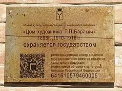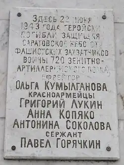 - ↑ Решение исполнительного комитета Саратовского областного Совета народных депутатов от 16 января 1986 г. «Об утверждении дополнительного перечня памятников истории и культуры г. Саратова, подлежащих государственному учету»