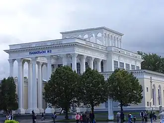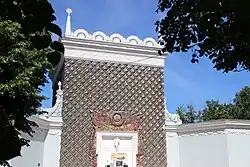 Главный вход | Архитектор И. Д. Мельчаков. Скульпторы Г. И. Мотовилов (рельефы на пилонах), С. М. Орлов, А. П. Антропов, Н. Л. Штамм, С. Л. Рабинович, И. Л. Слоним (скульптура тракториста и колхозницы)[4]. | 1951—1954 | |