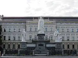 Памятник княгине Ольге, святым равноапостольным Кириллу и Мефодию, святому апостолу Андрею | Шевченковский район, Михайловская площадь | И. П. Кавалеридзе, Ф. П. Балавенский, П. В. Сниткин, В. Н. Рыков/Авторы реконструкции: В. И. Сивко, Н. И. Билык, В. Е. Шишов[6] | Памятник Ольге — княгине-регенту при своём малолетнем сыне Святославе с 445 по 462 год, первой правительнице на Руси принявшей христианство, почитаемой в христианстве равноапостольной святой, а также апостолу Андрею Первозванному, по преданию посетившему киевские холмы и предсказавшему основание Киева, и создателям славянской азбуки — святым Кириллу и Мефодию. Был разрушен в 1919 году и окончательно демонтирован в 1926 году, восстановлен в 1996 году[6]. Объект культурного наследия[7]. | 4 сентября 1911 года[6] |