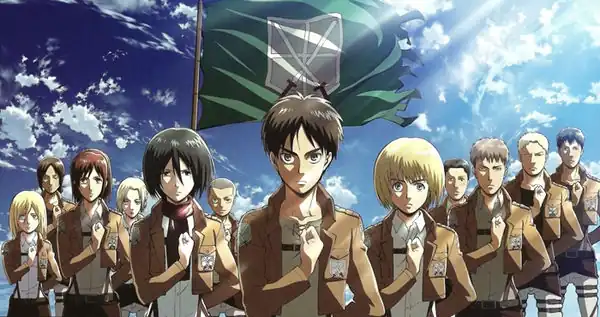 Слева направо: Хистория Рэйсс, Имир, Саша Браус, Анни Леонхарт, Микаса Аккерман, Конни Спрингер, Эрен Йегер, Армин Арлерт, Марко Ботт, Жан Кирштайн, Райнер Браун, Бертольт Хувер