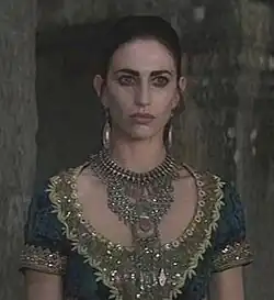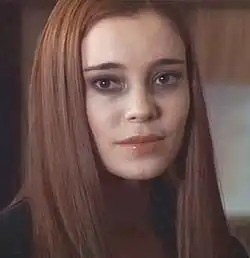 У вампирши длинные, волнистые коричневые волосы, белое лицо, что кажется, будто это искусственно созданная маска и неестественный блеск глаз.