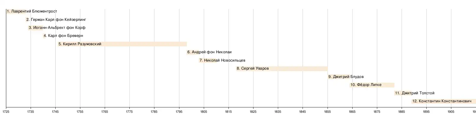 Петербургская академия наук была основана по распоряжению Петра I Указом правительствующего Сената от 28 января [8 февраля] 1724 года[1]. Президенты Академии не избирались, а назначались правящим монархом. Примечательно, что пятый президент Кирилл Разумовский с 1756 года академией не управлял, продолжая числиться её президентом номинально из-за отказа Екатерины II снимать его с поста. Вместо него назначались директора, де-факто осуществлявшие руководство: Владимир Орлов, Сергей Домашнев, Екатерина Дашкова и Павел Бакунин[2].