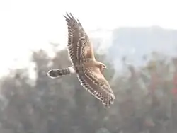 ![]() | Степной лунь Circus macrourus (S. G. Gmelin, 1771) | Отмечался в Краснокамском и Фёдоровском районах; в окрестностях городов Стерлитамак и Баймак, озёр Улянды, Сатка и Талкас, деревень Тавлыкаево, Мряушли, Новонагаево. Также отмечался как редко гнездящийся вид нагорно-лесостепных ландшафтов Зилаирского плато. Обнаружены два гнёзда возле села Баимово. Встречался в Зианчуринском районе, около реки Шады (Мишкинский район), в окрестностях городов Белорецк и Нефтекамск, возле озера Коряжное, в пойме рек Малый Кизил и Таналык. Всего в республике насчитывается не более 200 особей. Лимитирующие факторы: ухудшение гнездовых и кормовых условий, связанное с трансформацией гнездовых и кормовых биотопов, урбанизация территории[16]. | II | 2 | |