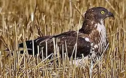 | Змееяд Circaetus gallicus (J. F. Gmelin, 1788) | По некоторым данным гнездился на горе Большой Иремель. Отмечался возле сёл Крепостной Зилаир, Сыртланово, Кузьминовка, Майка, Утяганово, Кляшево, Сабаево, в заповеднике «Шульган-Таш», в окрестностях озера Белое и Юмагузинского водохранилища, в пойме широтного течения реки Белая, на Зилаирском плато. На территории республики возможно гнездование единичных пар. Лимитирующие факторы: низкая численность змей и низкая плодовитость вида в сочетании с большой осторожностью[18]. | I | 2 | | |