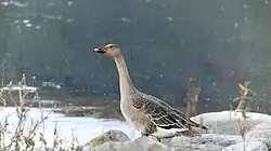 Серый гусь | Anser cygnoides (Linnaeus, 1758) | Гнездится в Северной и Центральной Европе, а также в умеренном поясе Азии вплоть до Дальнего Востока. В России распространён от Причерноморья до Приморья, южнее лесного пояса и в лесной полосе от Балтики до Урала. Зимует в Южной Европе и Азии, иногда в Северной Африке | LC | И |