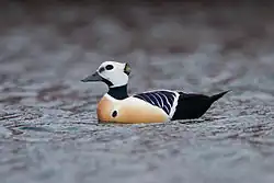 Сибирская гага | Polysticta stelleri (Pallas, 1769) | Основная часть ареала вида находится в низменных приморских тундрах Якутии и частично на Ляховских островах и островах Анжу Новосибирского архипелага. Регулярно гнездится на Таймыре. Встречается на гнездовании на Ямале и Гыдане, единично и крайне редко – на Кольском полуострове, Чукотке и Аляске. | VU | У |