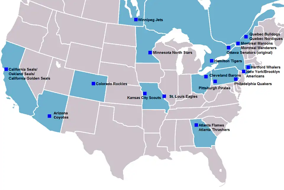 | Виннипег Джетс[4] | 1979 | 1996 | 17 | 0 | Финикс Койотис[5] | Продана группе инвесторов с целью переезда в поисках лучших финансовых условий |