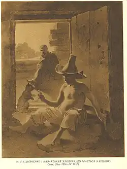 ![]() | Т. Г. Шевченко рисует крестьянское подворье | Бумага, сепия | 18,5×27 | весна 1845 | [83] |