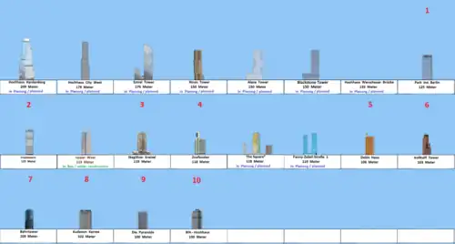 В данном списке отсутствуют здания «Европа-Центр» (архитектурная высота 86 м, высота с учётом антенны 103 м)[1] и Bahntower (архитектурная высота 94 метра, высота с учётом антенны также 103 м)[2].