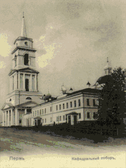 В 1823 году началось возведение колокольни при пермском Кафедральном соборе. Колокольня Спасо-Преображенского собора строилась восемь лет и только в 1831 г. на неё подняли старинные колокола бывшего Пыскорского монастыря. Высота колокольни была 67-метров. В годы гражданской войны в колокольню попал снаряд, и верхний этаж кафедрального собора Спасо-Преображенского монастыря сгорел. Позднее его не стали восстанавливать, и сейчас колокольня на один этаж ниже.