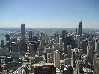 Небесная линия Чикаго с высоты башни Джон Хэнкок центр. Аон центр слева и Сирс тауэр справа